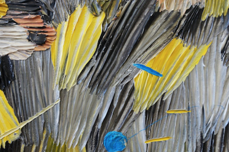 The works commissioned for LAND are a stepping stone in the greater evolution of Manley’s Elegy for Whatever paintings: a series of works that continue his meditations on our times. The media has increasingly filled the artist with an overwhelming sense of anxiety; the Elegy paintings allow Manley to process disturbing international events and to find a personal form of conflict resolution. Manley uses very little brushwork in these pieces. Visible instead are “puncture dashes” that came out of that aforementioned anxiety-the slashes are notations that Manley used to remind himself of areas that he wanted to revisit. The paintings are an opportunity to reflect on previous iterations studying concepts of pre-textural forms of communication, and the history of text in painting and figurative movement. Manley’s vertical application of paint echoes Japanese 19th century Edo woodblock prints whose often “impossible” perspectives suggest a mental exercise or frame of mind worth emulating.